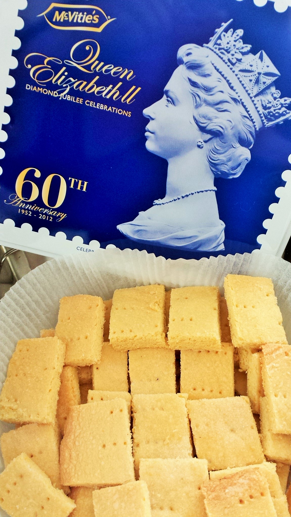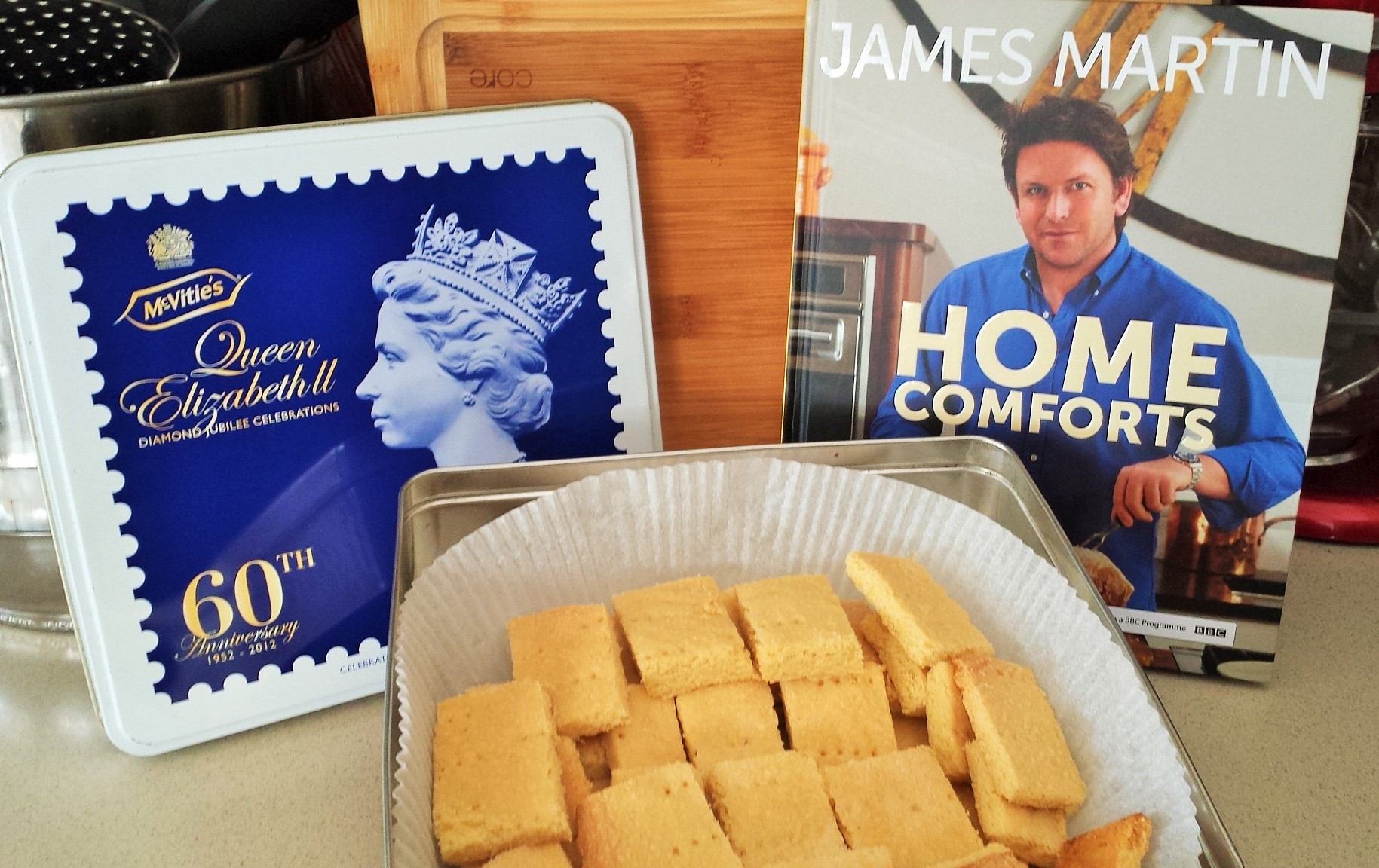 Today the Queen’s tummy is full. I’ve tried several recipes in order to perfect the shortbread cookies (biscuits in the U.K.) we love. Mary Berry uses semolina in her mixture; James Martin calls for confectioner’s sugar and corn flour. Both British bakers have completely different approaches to shortbread than American bakers. In fact, every recipe I read, British, American, wherever – was different. I guess it’s a matter of which recipe satisfies your taste buds. Today – in celebration of Her Majesty The Queen, we’re doing the James Martin version, with a dash of Jann thrown in.